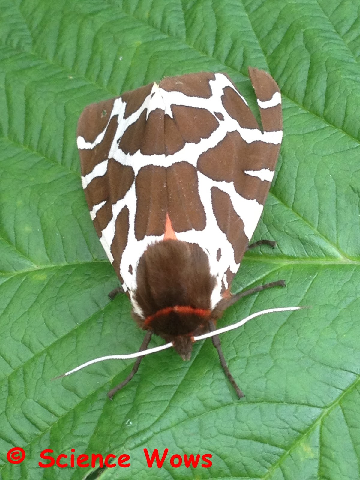 Underneath these beautiful front wings are equally impressive back wings of striking orange colour with black spots. If disturbed the moth will flash these back wings before flying off which both confuses predators and warns them that it is toxic.