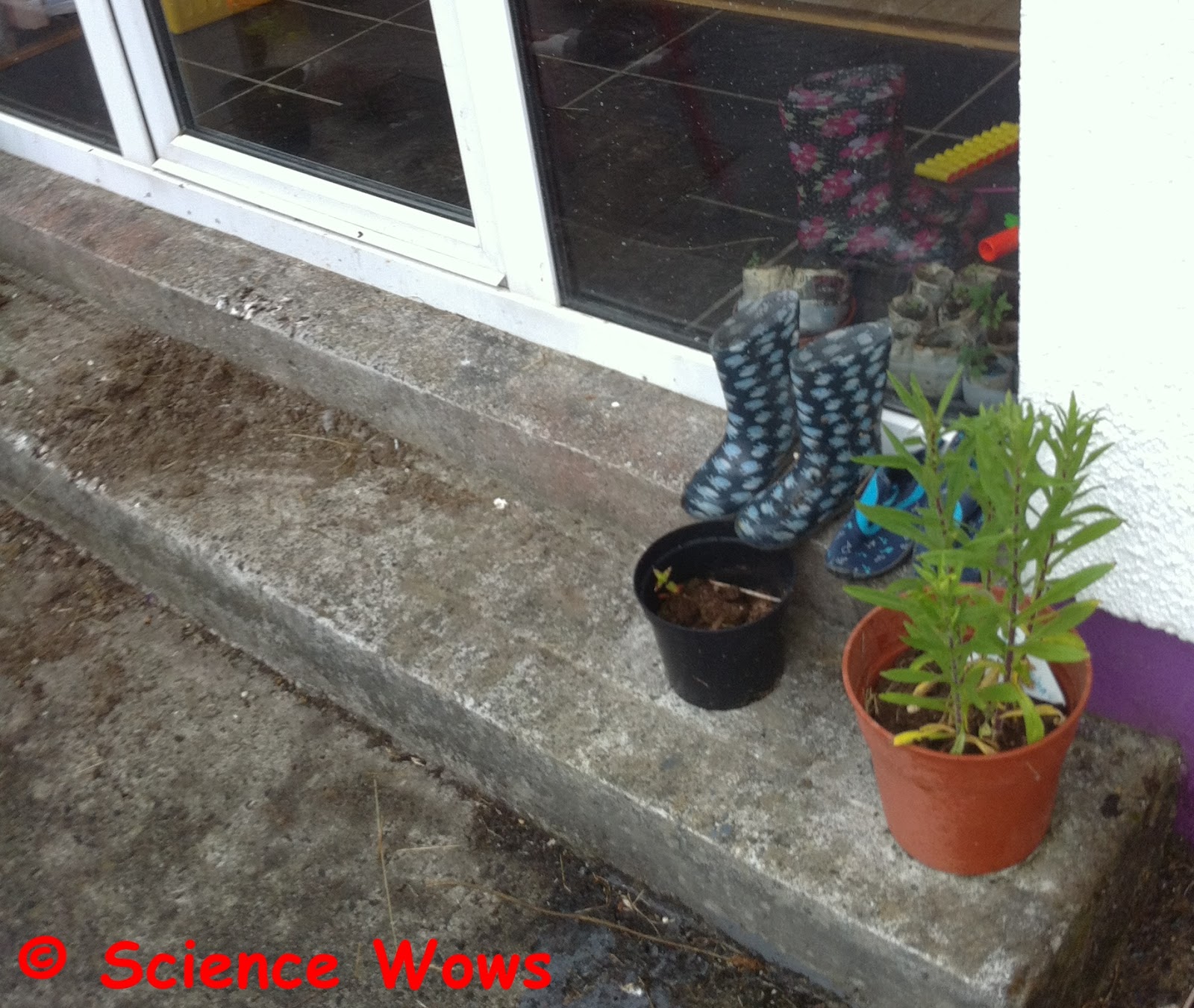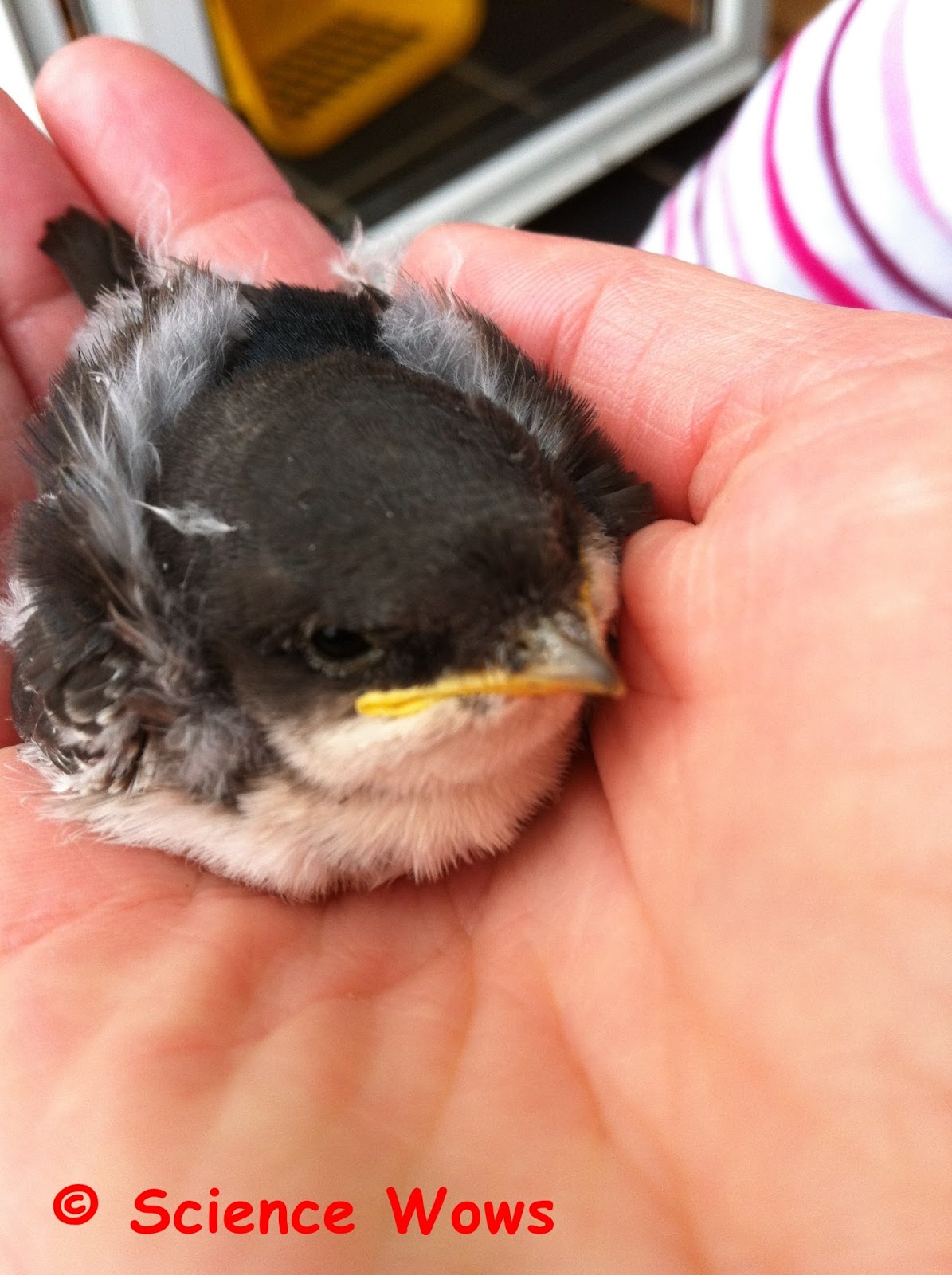 These House Martins are part of the family at this stage, our very “welcome house guests“. The children get up every morning and check on the nest (by check the nest I mean look up and see if any chicks have their head peeping out or parents flying back and forth). Anyway, on Saturday something was obviously wrong. When myself and the hubby got to the door we saw a pile of brown dusty clay on the ground and when we looked up there was nothing left of the two nests we had been monitoring so carefully. PANIC and DEVASTATION! Was it a natural collapse? Was it the dreaded Magpies? There was very little left except this small pile of dust. While trying to calm the children and work out what had happened we started to look around. That’s when my hubby spotted him, crouched behind a large plant pot but seemingly healthy and unharmed… one lovely little fledgling!
